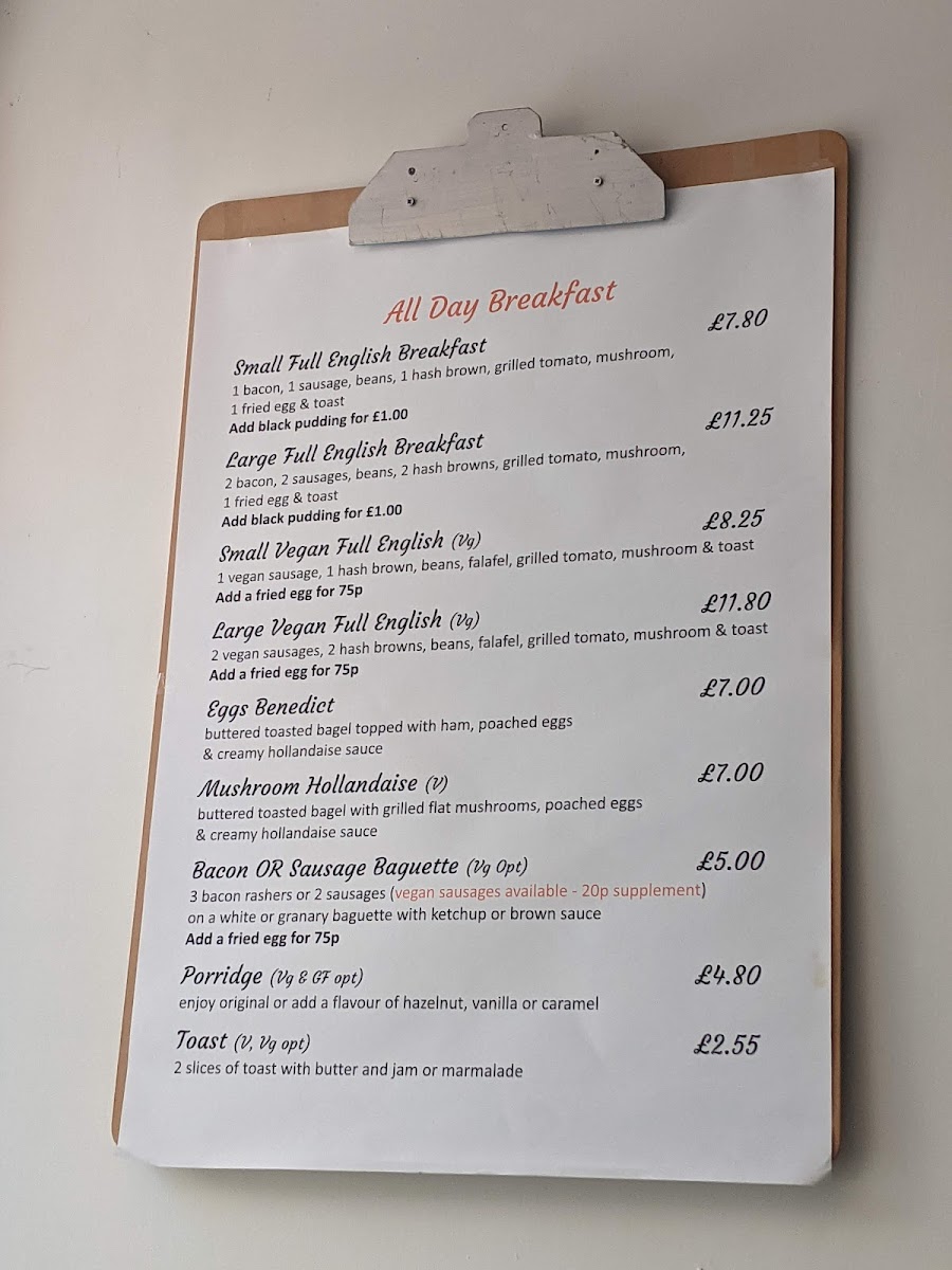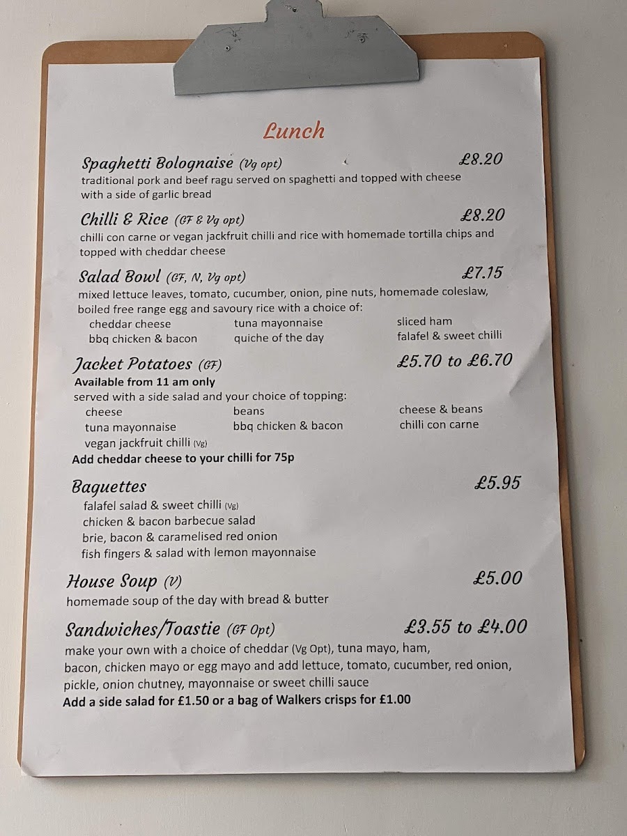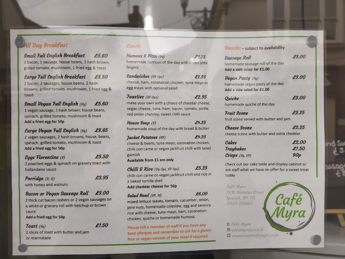 The menu at Cafe Myra / Cheese and Wine at Myra offers a delightful mix of options catering to various tastes and dietary preferences. For those looking for a hearty start, the Small Full English Breakfast (£6.50) and Large Full English Breakfast (£8.50) are popular choices, with gluten-free options available. Vegans can enjoy the Small Vegan Full English (£6.50) or the Large Vegan Full English (£8.50), both packed with flavor. For a lighter option, the Mushroom Hollandaise (£7.50) offers a rich, creamy twist on a classic. Lunchtime brings a variety of fresh, satisfying meals such as the Beef Taco Salad (£8.50, with a vegan option) and the comforting Spaghetti Bolognese (£9), which can also be made vegan. The Chilli & Rice (£8) is another hearty option with both vegan and gluten-free variations. For a healthier choice, the Salad Bowl (£7) and Jacket Potatoes (£5.50) are great, customizable picks. The Lighter Appetite menu features indulgent yet light choices like Sandwiches and Toasties (from £5), Sausage Rolls (£3), and Cheese and Leek Quiche (£5.50), along with delicious baked goods like Fruit Scones (£2.50) and Cheese Scones (£2.50). With a variety of options, there's something for everyone, whether you're after a filling breakfast, a light lunch, or a tasty snack.